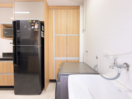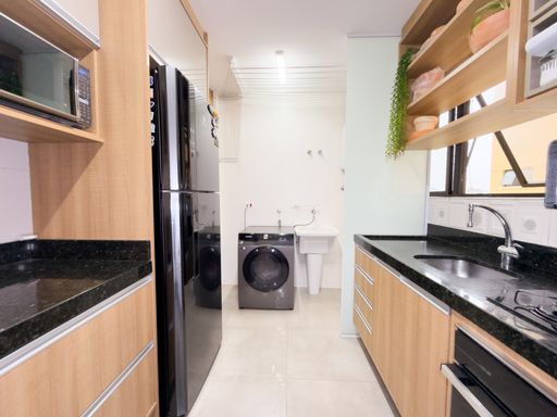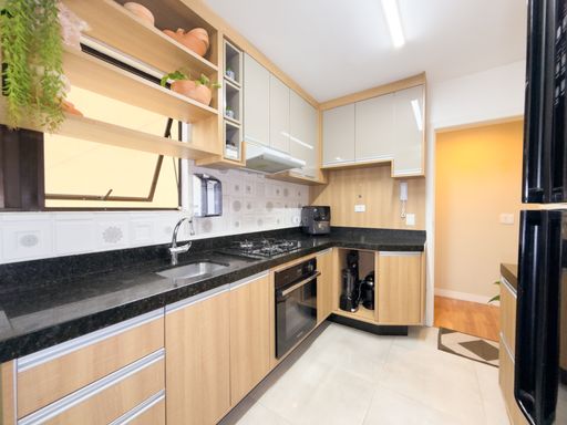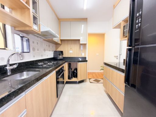 • Cozinha equipada com móveis planejados, fogão cooktop e coifa;