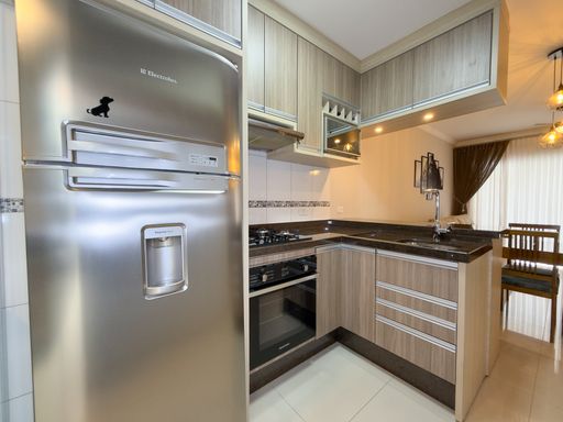 • Cozinha com móveis planejados, fogão, coifa e forno elétrico
