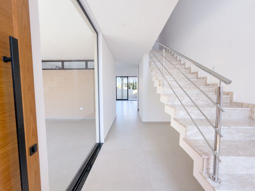• Escada revestida em mármore travertino com corrimão em vidro temperado;