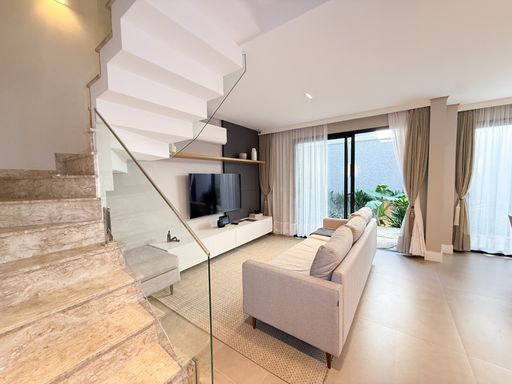 • Escada revestida em mármore travertino com corrimão em vidro temperado;