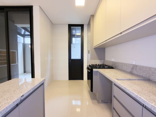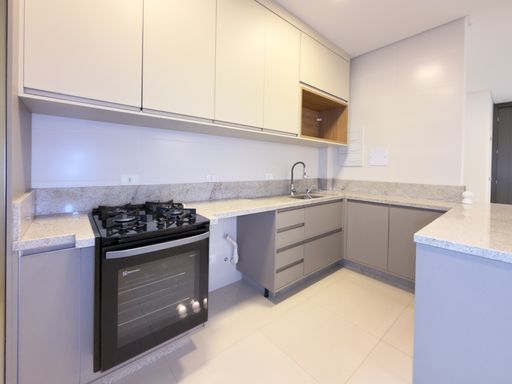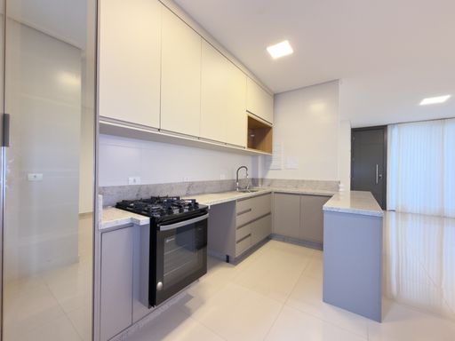 • Cozinha com armários planejados, fogão e luminária;