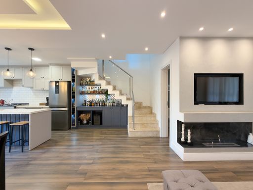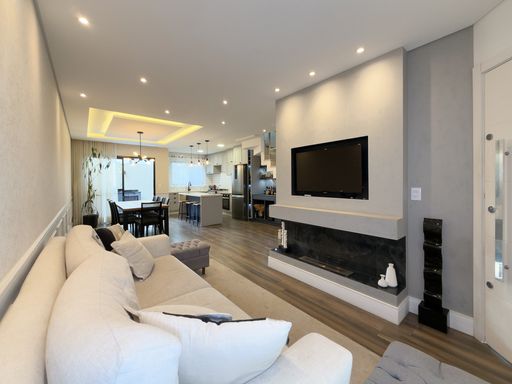 • Sala em conceito aberto com painel de TV planejado, lareira, luminárias, cortinas e iluminação em LED.