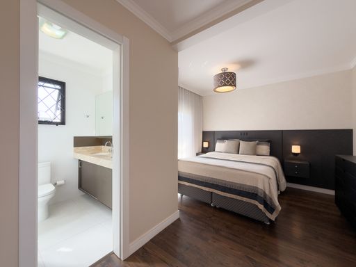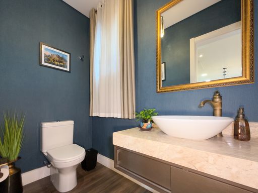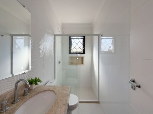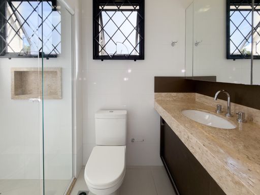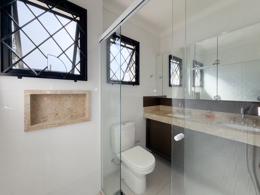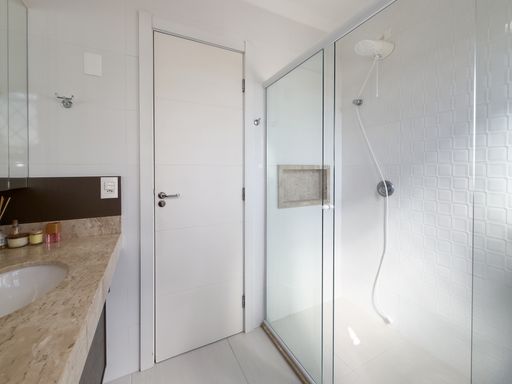 • Banheiro da suíte com duas cubas, dois chuveiros, box blindex e armários planejados.