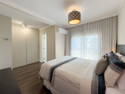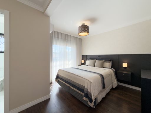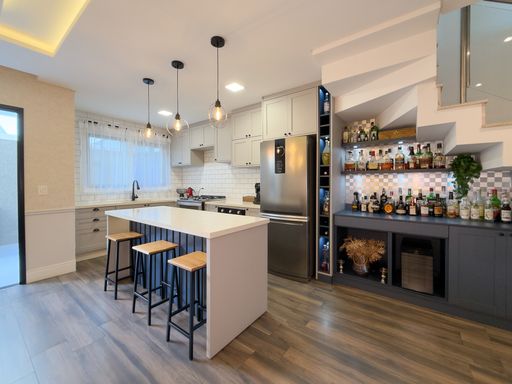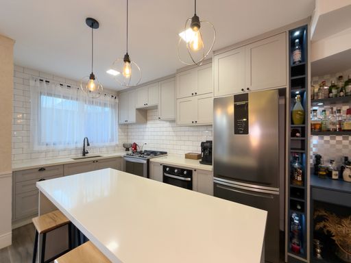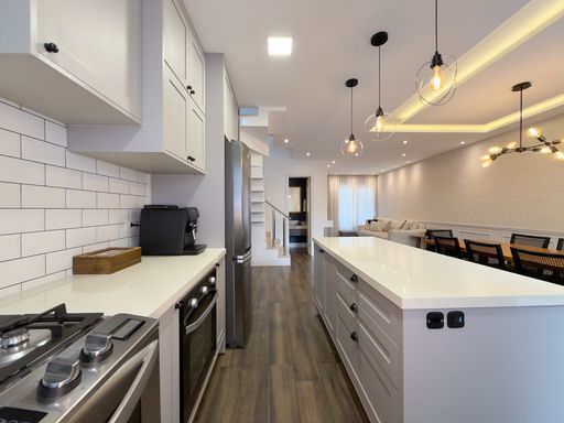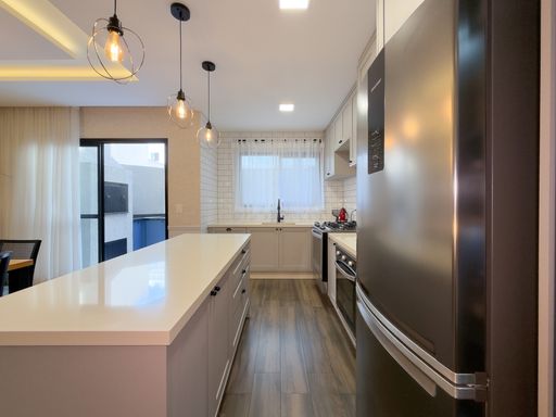 • Cozinha integrada à sala de jantar, equipada com móveis planejados, balcão em quartzo italiano, fogão 5 bocas, forno elétrico e armários embutidos.