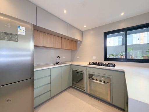 • Cozinha com armários planejados, fogão e luminária.