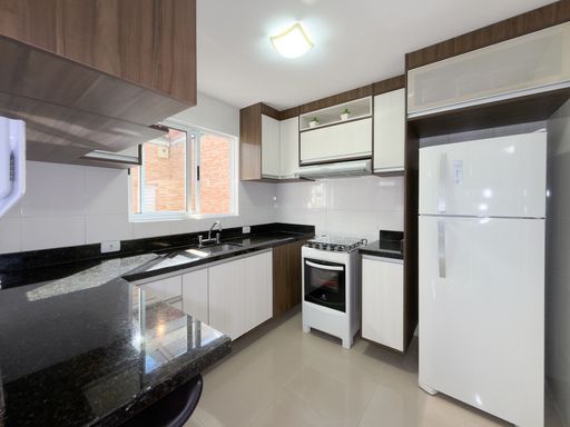 • Cozinha com móveis planejados, geladeira, fogão e micro-ondas